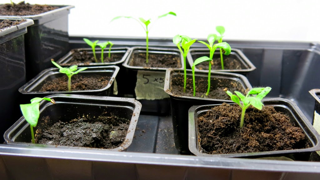 Z czternastu nasion Cheyenne Orange, posadzonych "na wariata" przed wyjazdem, wykiełkowało sześć roślinek. Rosną na tyle dobrze, że dziś postanowiłem je przesadzić do pojedynczych doniczek. Reszta ziemi z nasionami, które gdzieś tam w niej są trafiła do ciepłej łazienki- może coś jeszcze wykiełkuje? Po przesadzeniu sadzonki dostały na spód doniczek gruby keramzyt, który ma pomóc w dostępnie powietrza do korzeni, oraz zostały podlane biohumusem w stężeniu: 2 nakrętki na jeden litr (zaniżone stężenie, tak na początek). Oczywiście po podlaniu wszystko osiadło i porobiły się doły. Zasypałem więc wszystko na koniec ziemią, może trochę za wysoko. Ale po następnym podlaniu znowu ziemia opadnie, więc pewnie będzie dobrze. Cheyenne po przeprowadzce prezentują się tak: