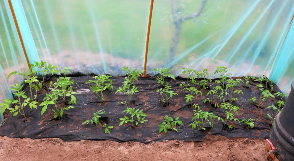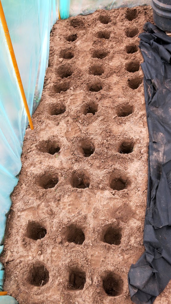 Na ziemię położyłem cienką włókninę (ta którą kupiłem jest trochę za cienka, na szczęście na warunki pod folią powinna wystarczyć), oznaczyłem miejsca pod dołki, ponacinałem materiał, potem znowu go zdjąłem i wykopałem "domki":