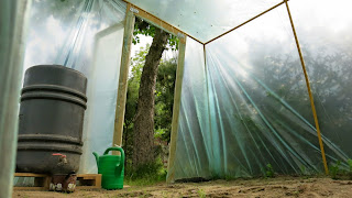 Jak widać na zdjęciu, pomidory są w opaskach i nie leżą bezpośrednio na ziemi (żeby przypadkiem nie zaczęły w niej rosnąć). Szklarnia nie jest za duża, ale za to sprawia wrażenie solidnej (oczywiście nie ja ją budowałem, bo wtedy pewnie by się tak fajnie nie prezentowała). W środku wygląda tak: